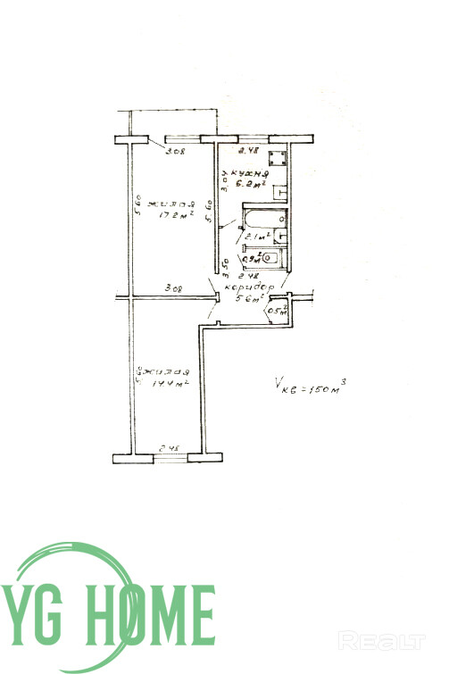 Площадь комнат 17,2 м2 и 14,4 м2., кухни 6,2.
