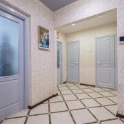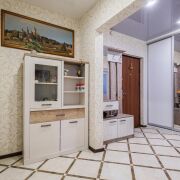 -Коридор оформлен плиткой, со светлыми обоями и натяжным потолком. Здесь установлен вместительный шкаф-купе, который остаётся вам, установлен видеодомофон.
