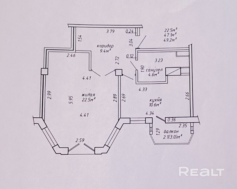 Общая площадь - 47,1 м2 (по СНБ 49,42м2), жилая 22,5 м2, кухня 10,6 м2.