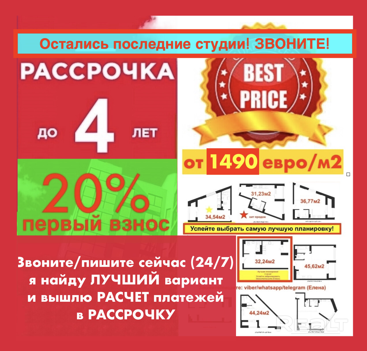 Последние студии - звоните прямо сейчас (24/7)! Выбор этажей и планировок! Вышлю РАСЧЕТ платежей в РАССРОЧКУ на 4 года! Рассрочка БЕЗ СПРАВОК и ПОРУЧИТЕЛЕЙ - только ваш паспорт! Первый взнос всего 20%! Продажа напрямую от застройщика, по ценам застройщика, без комиссий агентству! - Б Е С П Л А Т Н О и профессионально помогу подобрать самый лучший для Вас вид из окна, вариант планировки и расположения дома!