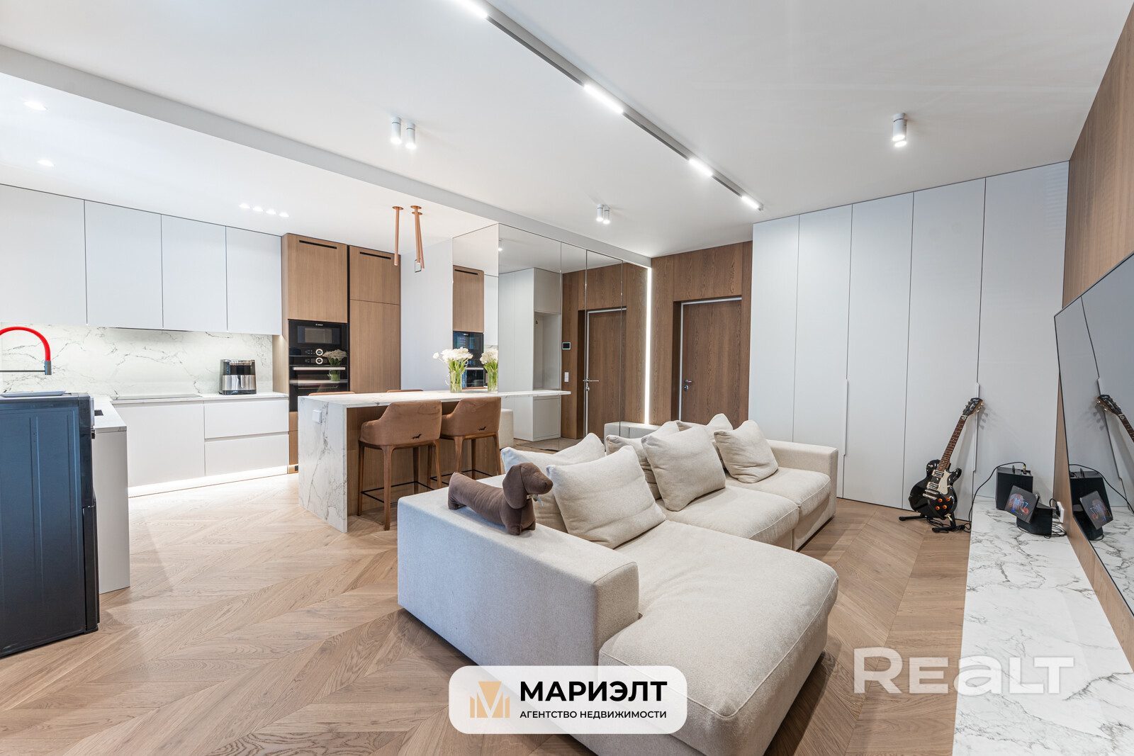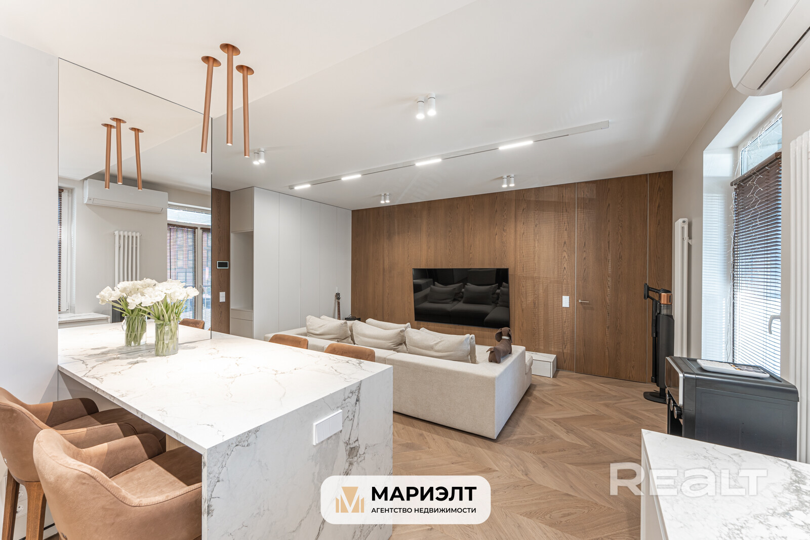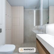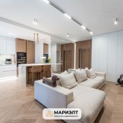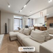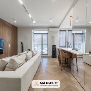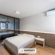 В квартире сделан дизайнерский ремонт с использованием самых качественных и экологически чистых строительных материалов. На полу дубовая паркетная доска Coswick, стены выровнены и окрашены, в отделке так же использованы панели из шпона дуба. Световое решение продумано до мелочей. В санузле уложена широкоформатная плитка, установлена импортная сантехника, стиральная машина Bosch, есть выводы для сушильной машины и бойлера.  Установлены кондиционеры. Межкомнатные двери скрытого монтажа с алюминиевым профилем. В квартире предусмотрена спальня с вместительной гардеробной и просторная зона кухни-гостиной.