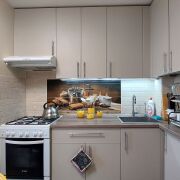 На кухне установлен вместительный эргономичный кухонный гарнитур с продуманной системой хранения.