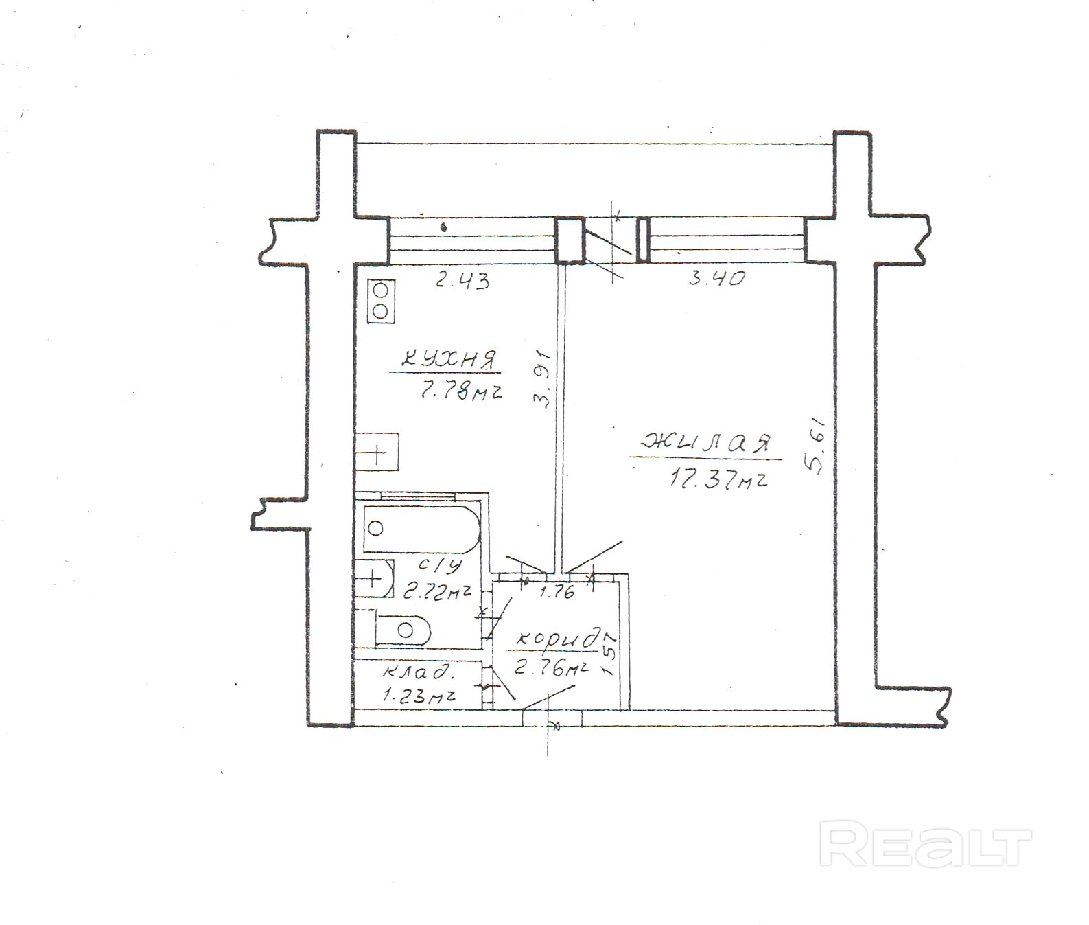 Общая площадь квартиры по СНБ – 35,8 кв. метров, общая- 31,9 кв. метров, жилая- 17,4 кв. метров , кухня-7,8 кв. метров.