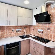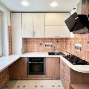 -На кухне установлена современная мебель, варочная панель и высококачественная техника, а стильная плитка в теплых оттенках добавляет уют.