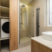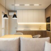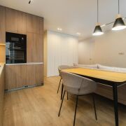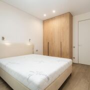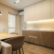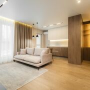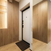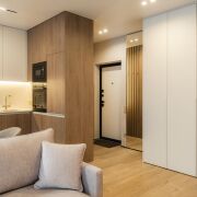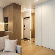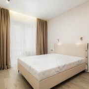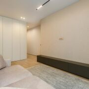 -Особое внимание стоит уделить функциональным элементам — встроенным шкафам и дизайнерским шторам, а также скрытым дверям, которые гармонично дополняют стиль квартиры.