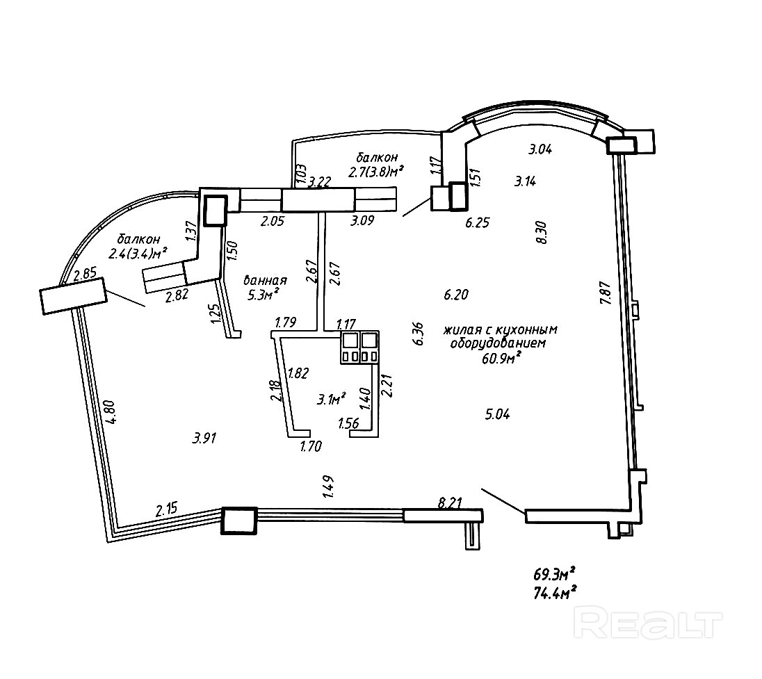 Удобная планировка в 74,4 м2 максимально грамотное использование пространства.