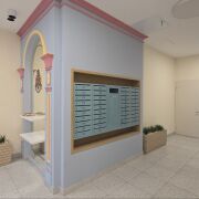 Стильный, современный, проходной подъезд - лобби с зоной ожидания и туалетом.