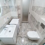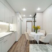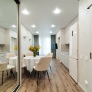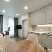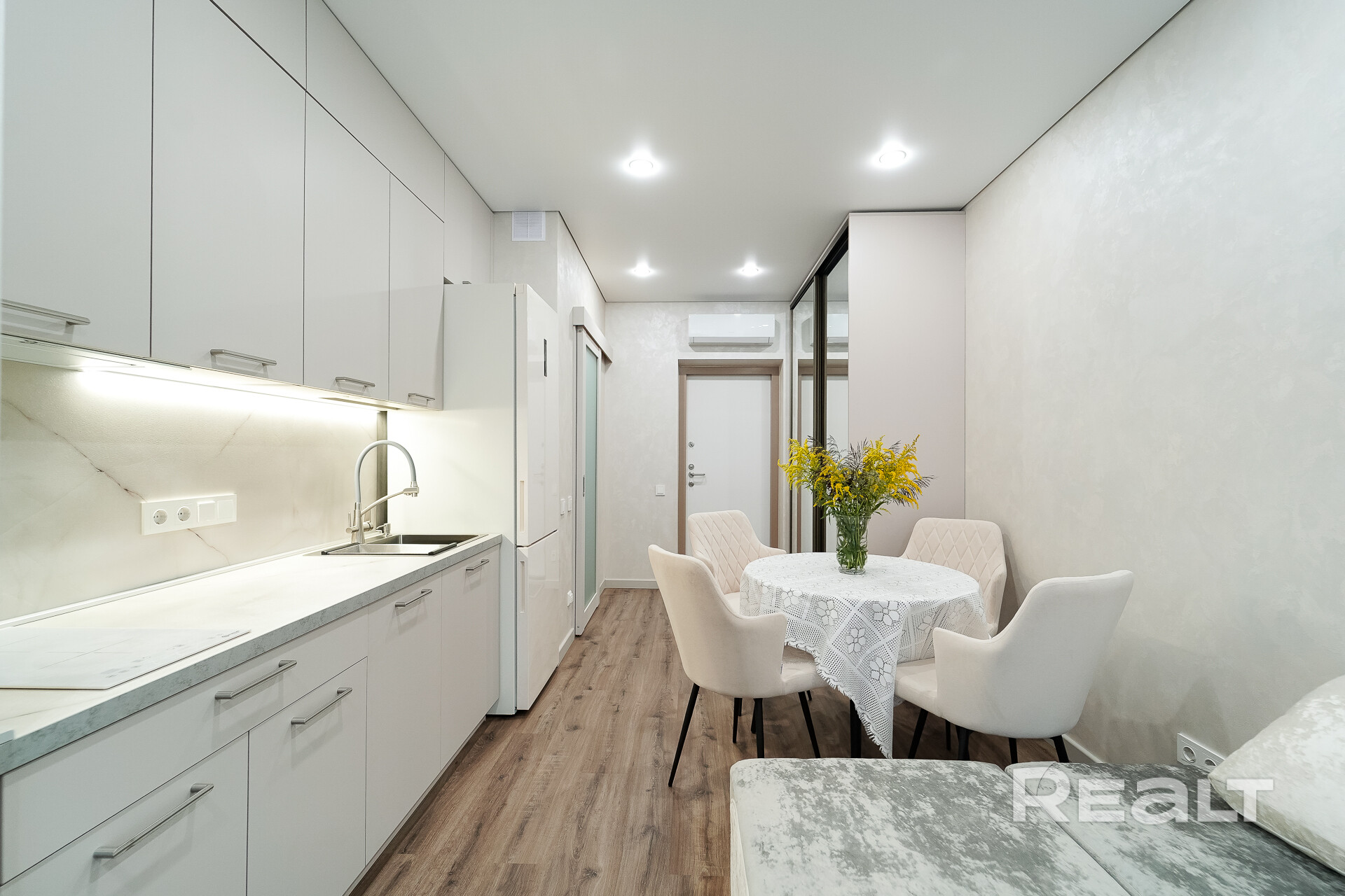 Выполнен качественный ремонт: стены отделаны декоративной штукатуркой, на полу- кварцвинил, в ванной комнате — пол с подогревом. Установлены энергосберегающие стеклопакеты в алюминиевом профиле с высокой звукоизоляцией, кондиционер, система фильтрации воды. Кухонная фурнитура — немецкого бренда. Вся сантехника — Германия и Польша, техника с расширенной гарантией до 5 лет.Дизайнер продумал грамотное зонирование — в квартире есть отдельная жилая комната.
