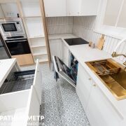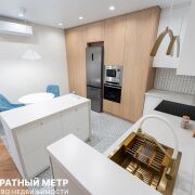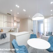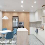 Кухня-гостиная с островной планировкой, оснащена полным комплектом техники Maunfeld: посудомоечной машиной, индукционной плитой, духовым шкафом, и отдельно стоящим большим холодильником. В вашем распоряжении огромное количество мест хранения. Предусмотрена сдвижная перегородка для усиления зонирования и приватности. Керамогранит, уложенный в этой зоне добавляет практичности, а удобный диван перед ТВ-зоной, и разные сценарии освещения выгодно подчеркивают детали интерьера.
