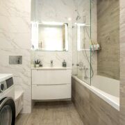 - Санузел выполнен в современном стиле с продуманной эргономикой. Справа расположена ванна с лаконичной сантехникой, формирующая комфортную зону для отдыха. По центру — раковина с зеркалом, визуально расширяющим пространство и добавляющим света. Слева аккуратно интегрирован унитаз, что обеспечивает удобство и логичную организацию помещения.