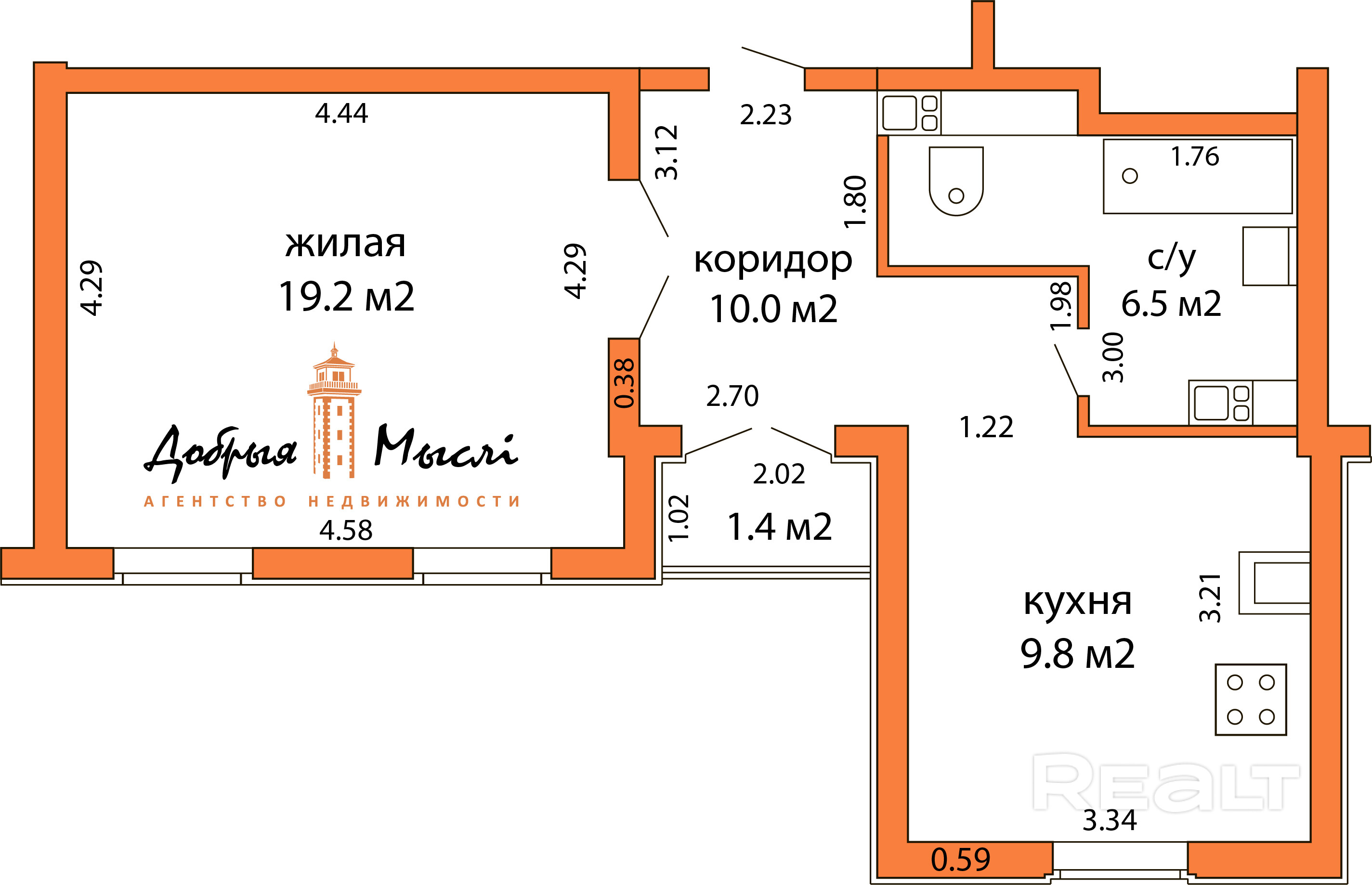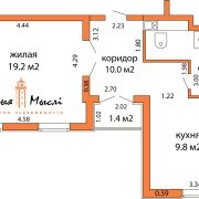 Параметры квартиры: общая площадь 45,5 кв.м., по СНБ 46,9 кв.м., жилая 19,2 кв.м, кухня 9,8 кв.м. Высота потолков 2.7 м.