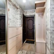- Из комнаты имеется выход в лоджию, которая обшита вагонкой и застеклена, а также предусмотрено дополнительное место для хранения. В коридоре — встроенный шкаф с комодом и прихожая зона. Входная дверь металлическая. Для хранения также предусмотрен подвал.