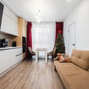 -Ремонт выполнен в современном стиле с акцентом на практичность и долговечность. На полу уложен ламинат тёплого оттенка, создающий ощущение уюта и цельности пространства. Потолки натяжные, ровные, с аккуратным освещением. Окна ПВХ обеспечивают хорошую шумо- и теплоизоляцию, входная дверь металлическая - надёжная и качественная.