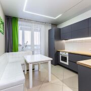 - Кухня выполнена из качественных материалов и имеет хорошую фурнитуру, оснащена всей необходимой мебелью и техникой. Также на кухне имеется теплый пол.