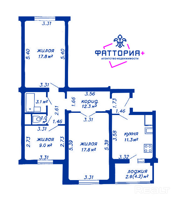 Планировка включает три раздельные жилые комнаты, метраж которых 17,8м2; 17,8м2 и 9м2,просторную кухню 11,3м2 с выходом на застеклённую лоджию и раздельный санузел.