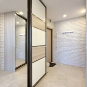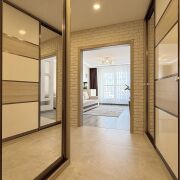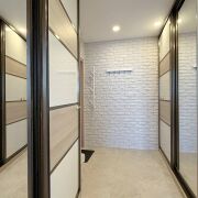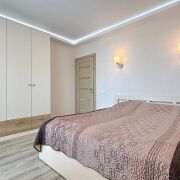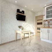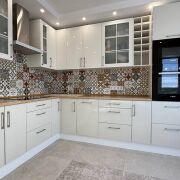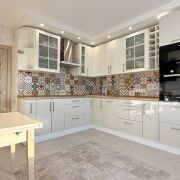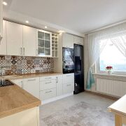 Кухня оборудована техникой Bosch — посудомойка и индукционная плита. Кухонные шкафы выполнены из крашеного МДФ с фурнитурой Blum, а также доводчиками. Вытяжка Сiarko с четырьмя режимами работы и подсветкой.