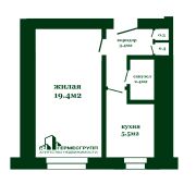 Площадь квартиры общая 31.4 м2, жилая 19.4 м2, кухня 5.5 м2.