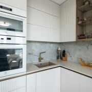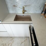 ·  Кухня высотой до потолка, столешница – камень, мойка подстольного монтажа – камень с латунным смесителем с выдвижным изливом и встроенным аэратором цвета матовое золото, профиль Gola цвет матовое золото, фасады – фрезерованный МДФ, фурнитура Blum.