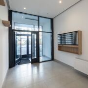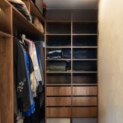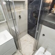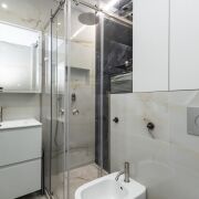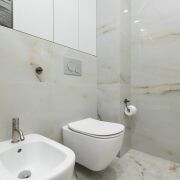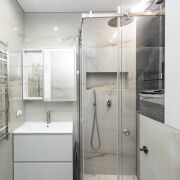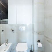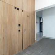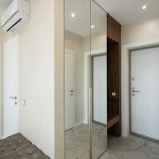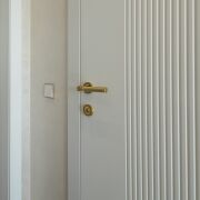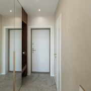 ·  Стильные двери с высоким верхним наличником и итальянской фурнитурой, привезенной под заказ. В двери встроены выпадающие пороги для повышенной звукоизоляции. Дверь в гардеробную – раздвижная безрельсовая система Magic. Скрытые в полу, выдвижные при открытии двери стопоры для дверей (Италия). Плинтуса – МДФ.
