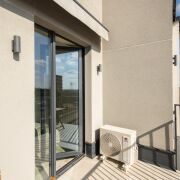 Солнечная терраса с прекрасным видом на Цнянку. Для защиты от солнца снаружи над дверью террасы установлена маркиза (открывается и закрывается с помощью пульта). Справа и слева от двери террасы установлены бра (включаются и выключаются в спальне внутри квартиры). На стене установлены 2 розетки с защитой от влаги IP54 и крышками.