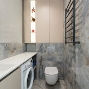 ·  Стены в комнатах – декоративная штукатурка, в санузлах – керамогранит размером 60 х 120 см.