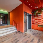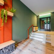 • На первом этаже – находится лапомойка, холл, два выхода из подъезда: один во двор, второй на улицу и к парковкам