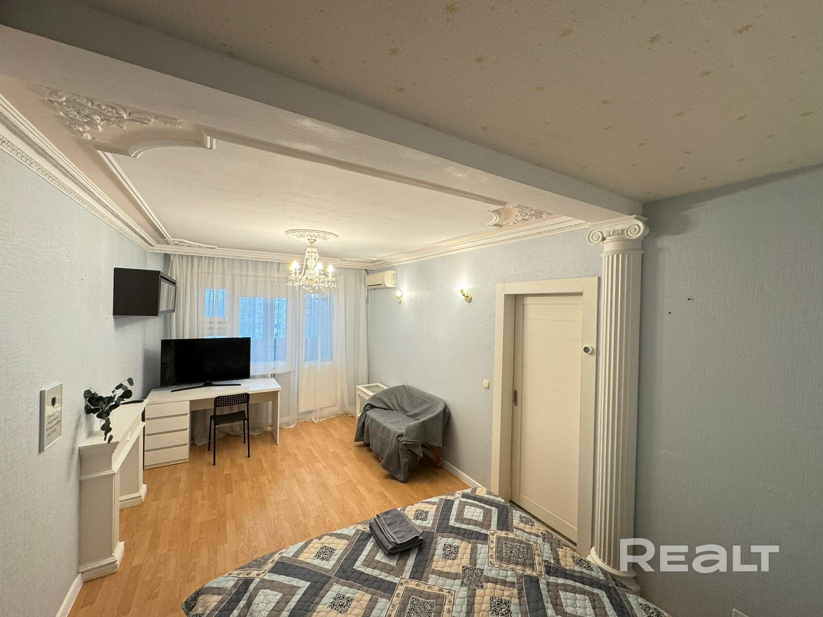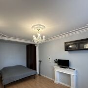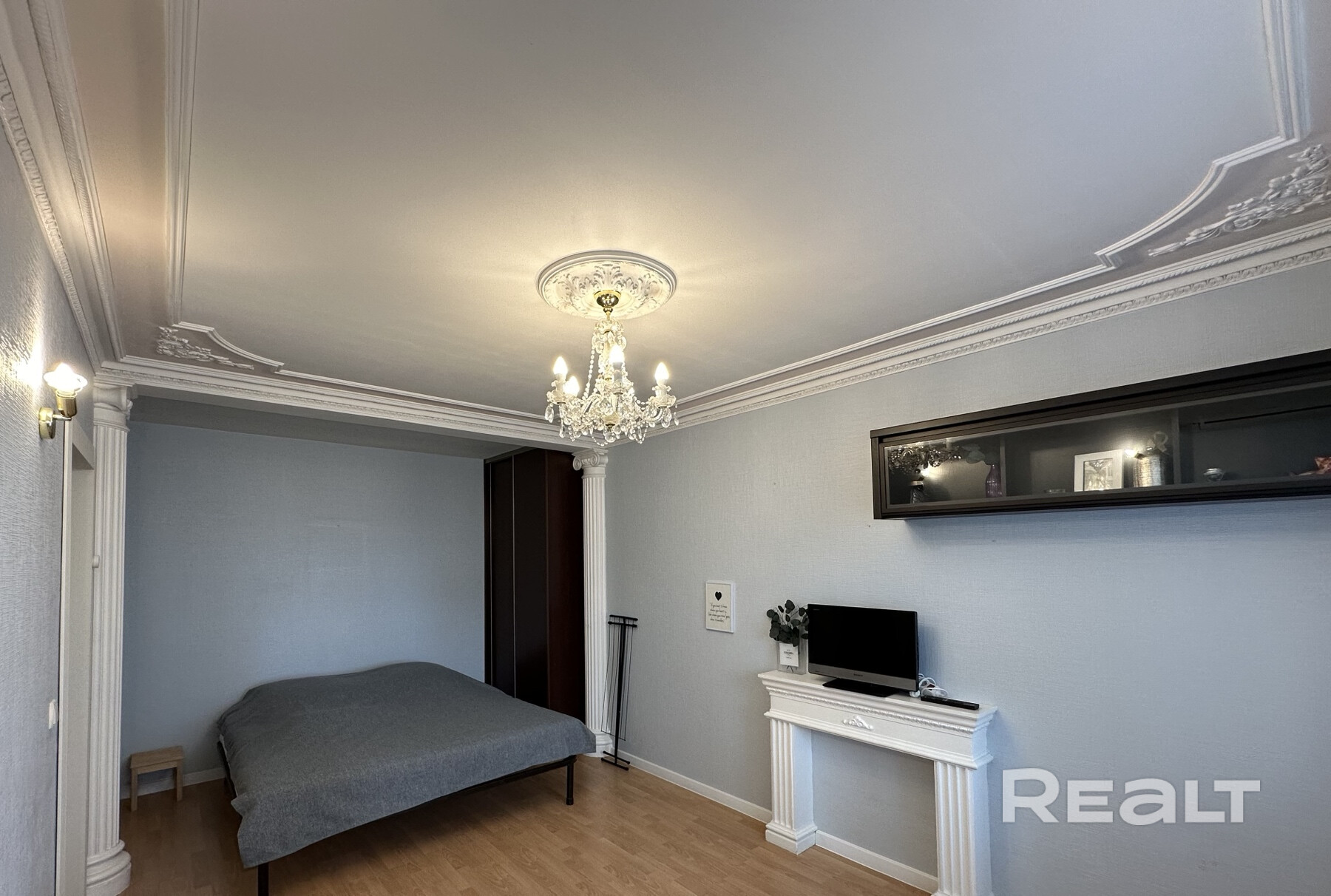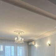 Гостиная украшена стильной гипсовой лепниной (колонны, портал под камин, потолок). Стены отделаны обоями под покраску с возможностью выбора цвета краски.