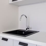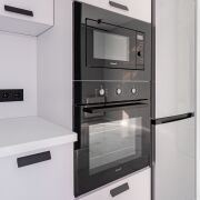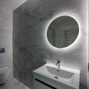 Полностью оборудованная кухонная зона готова к кулинарным экспериментам. В ванной — стильное зеркало с подсветкой.