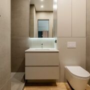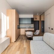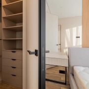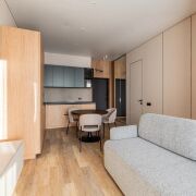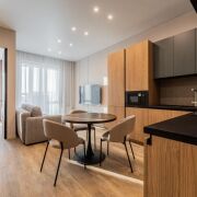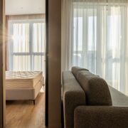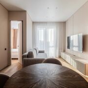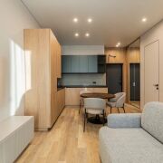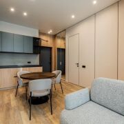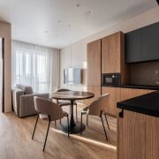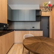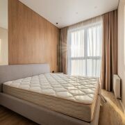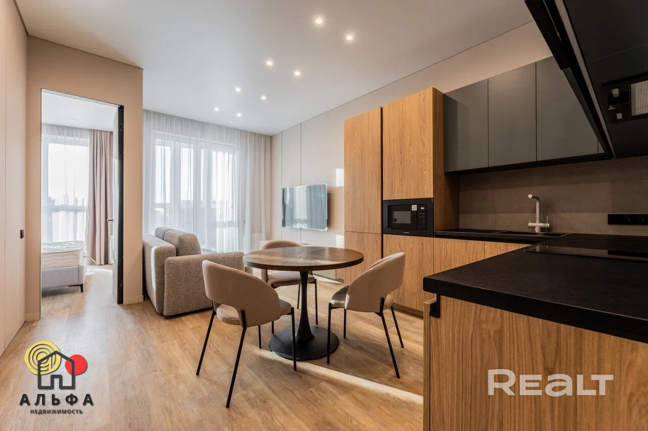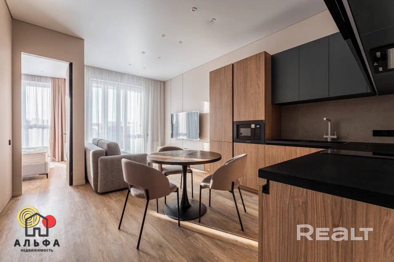 В продаже представлена видовая двухкомнатная квартира евроформата, расположенная в жилом комплексе Минск Мир, по адресу: улица Жореса Алферова, дом 7. Эта квартира находится на верхнем, 25-м этаже, что позволяет наслаждаться потрясающими видами и свежим воздухом. Площадь квартиры, согласно стандартам СНБ, составляет 40,8 квадратных метров, а еще и высокие трехметровые потолки, делают её достаточно просторной и уютной для комфортного проживания. Квартира находится в уникальном доме под названием «Манчестер», который расположен в квартале «Западная Европа». Этот дом стал символом современного стиля и комфорта, предлагая жителям все преимущества многофункционального комплекса Minsk World. Двухкомнатная квартира имеет продуманную планировку, включающую в себя спальню, кухню-гостиную, санузел и отдельную гардеробную, которая удобно расположена в спальне. Это идеальное решение для семейной пары или молодой семьи, которая ценит комфорт и уют. Одним из главных преимуществ данной квартиры является то, что вам не придется тратить время и усилия на ремонт. Она продается с уже выполненной дизайнерской отделкой из высококачественных материалов. В отделке использованы натуральные древесные элементы, которые присутствуют как в кухне, так и в предметах интерьера, мебели. Все двери в квартире имеют скрытый монтаж и оснащены итальянской фурнитурой, что добавляет дополнительный шарм и элегантность. Гостиная комната совмещена с кухонной зоной. Кухня выполнена из натуральных материалов и оборудована встроенной техникой, включая холодильник, индукционную варочную поверхность, духовой шкаф, вытяжку, посудомоечную машину и микроволновую печь. В зоне гостиной установлен большой телевизор, а также удобно расположился раскладной диван, что позволяет создать комфортное место для отдыха и развлечений. Освещение в кухне-гостиной организовано с учетом различных сценариев, что позволяет создавать уютную атмосферу в любое время суток. Спальня оформлена в спокойных, нейтральных тонах, что создает расслабляющую обстановку для отдыха. Вход в вместительную гардеробную находится именно в спальне, что очень удобно. Гардеробная, оснащенная системой хранения, помогает оптимально использовать пространство и освобождает больше места для жизни. Санузел в квартире совмещенный и включает в себя все необходимое.