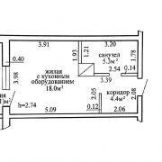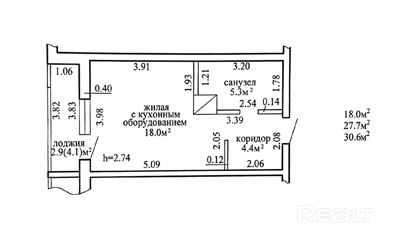 Площадь по СНБ 30.6 кв.м., общая 27.7 кв.м., жилая 18.0 кв.м.