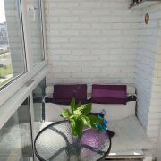 Балкон утеплён + оформлен декоративным кирпичом на стенах.