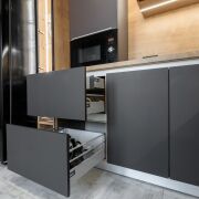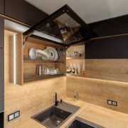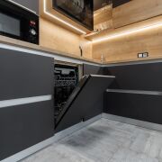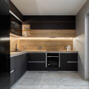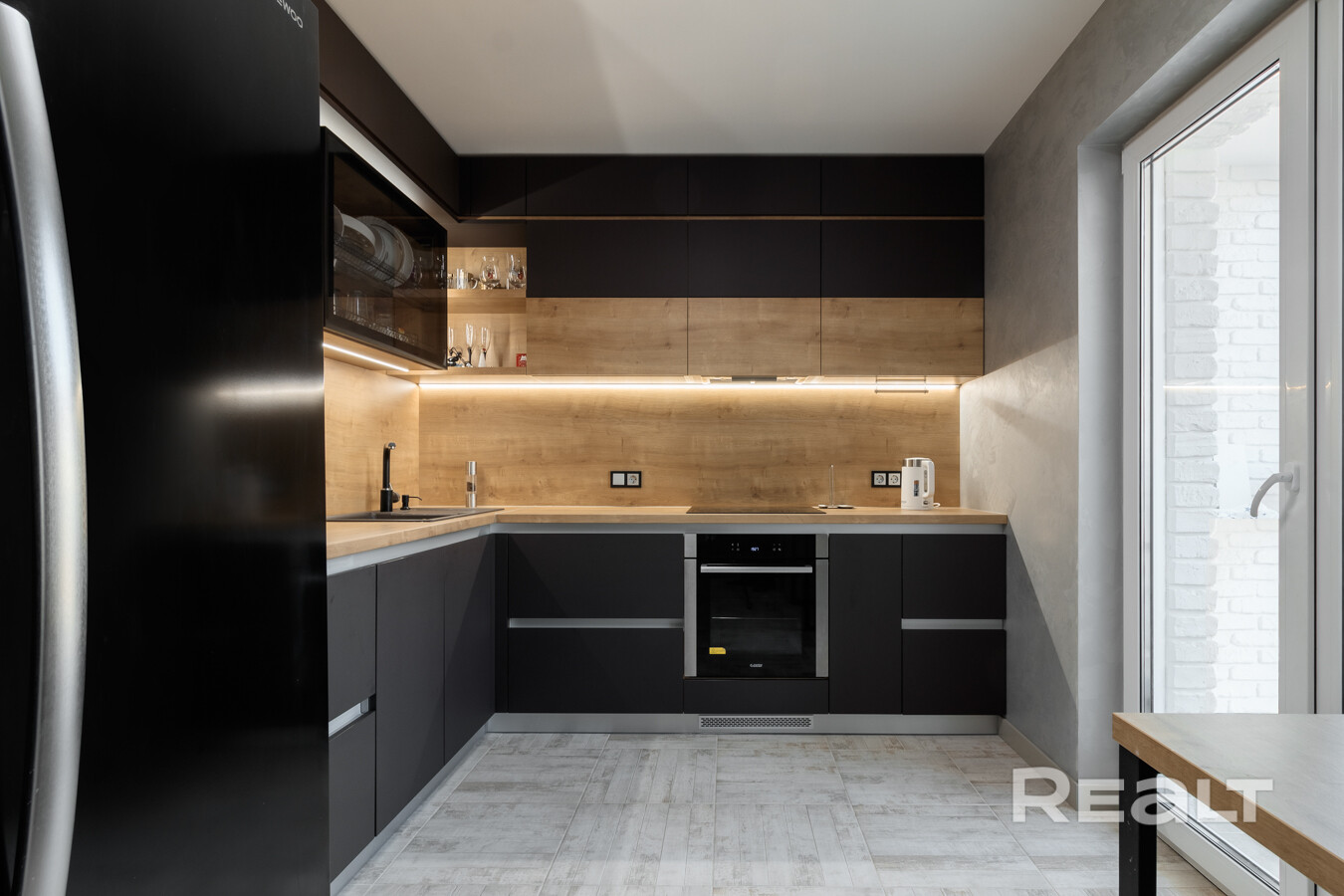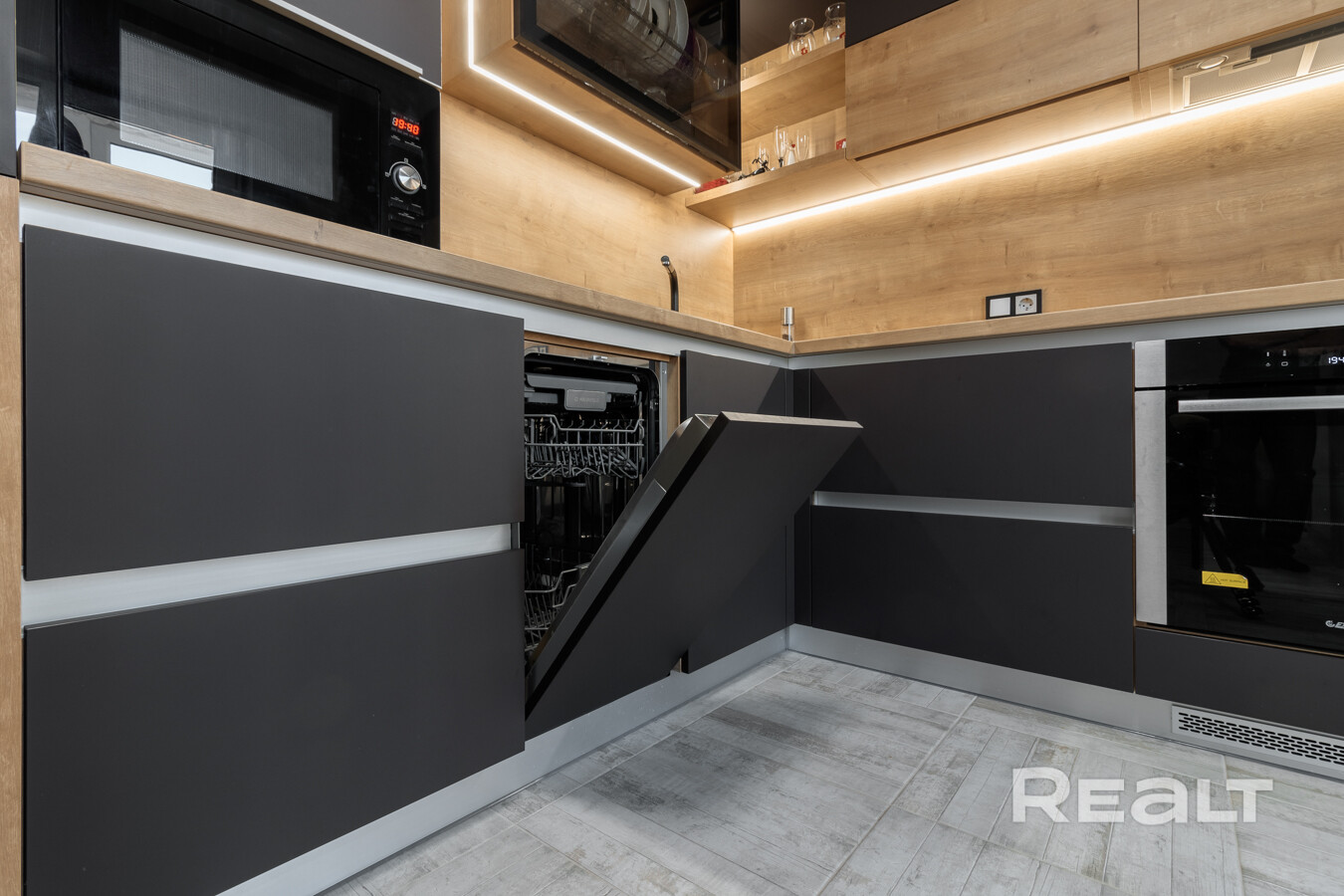 Кухня с посудомоечной машиной, индукционной плитой, вытяжкой, встроенной микроволновой печью и духовым шкафом. Холодильник двухстворчатый side-by-side.