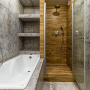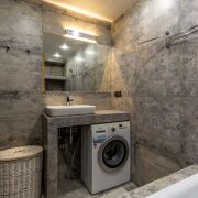 Большая ванная (ванна+душевая). Разные уровни подсветки создают как рабочий, так и романтичный настрой. Стиральная машина Simens установлена под столешницу умывальника.