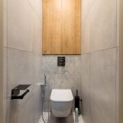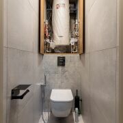 В туалете: бойлер, гигиенический душ, унитаз - инсталляция. Установлены большой водонагреватель и датчики протечки воды.