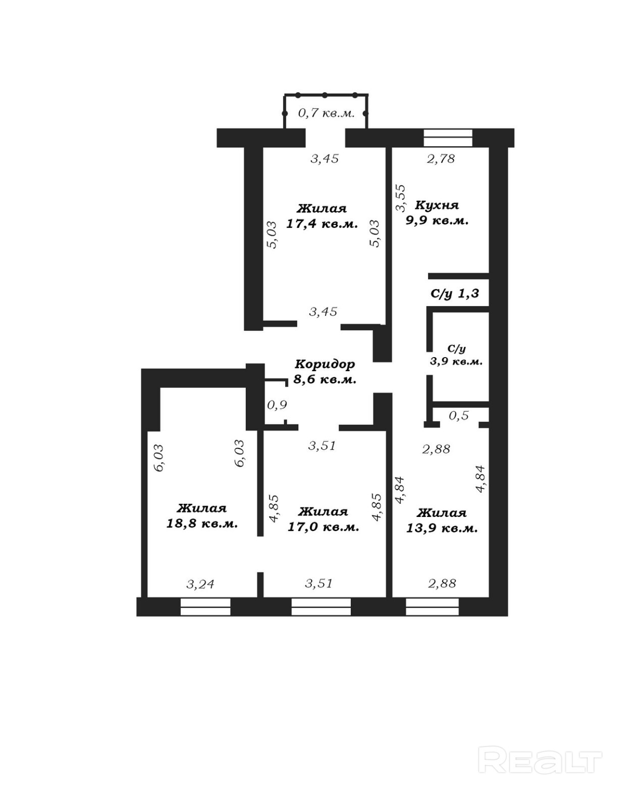 Площадь: общая по СНБ – 97,4 м2, общая – 96,7 м2, жилая 67,3 м2; кухни 9,9 м2;.