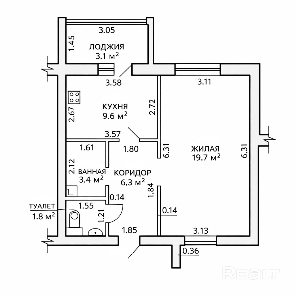 1-к в аг.Колодищи с отличным ремонтом! Площадь (СНБ): 43,9 м²