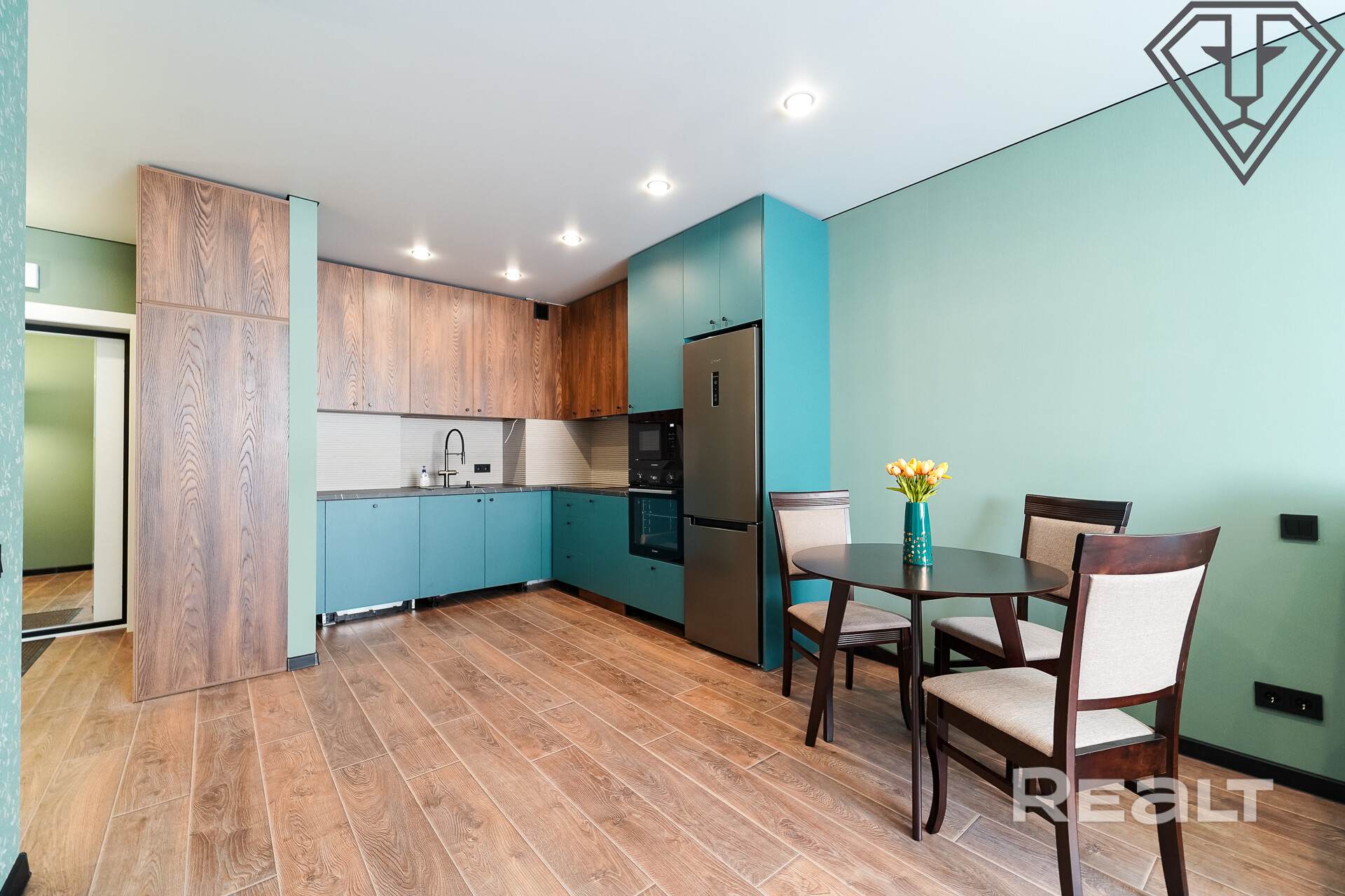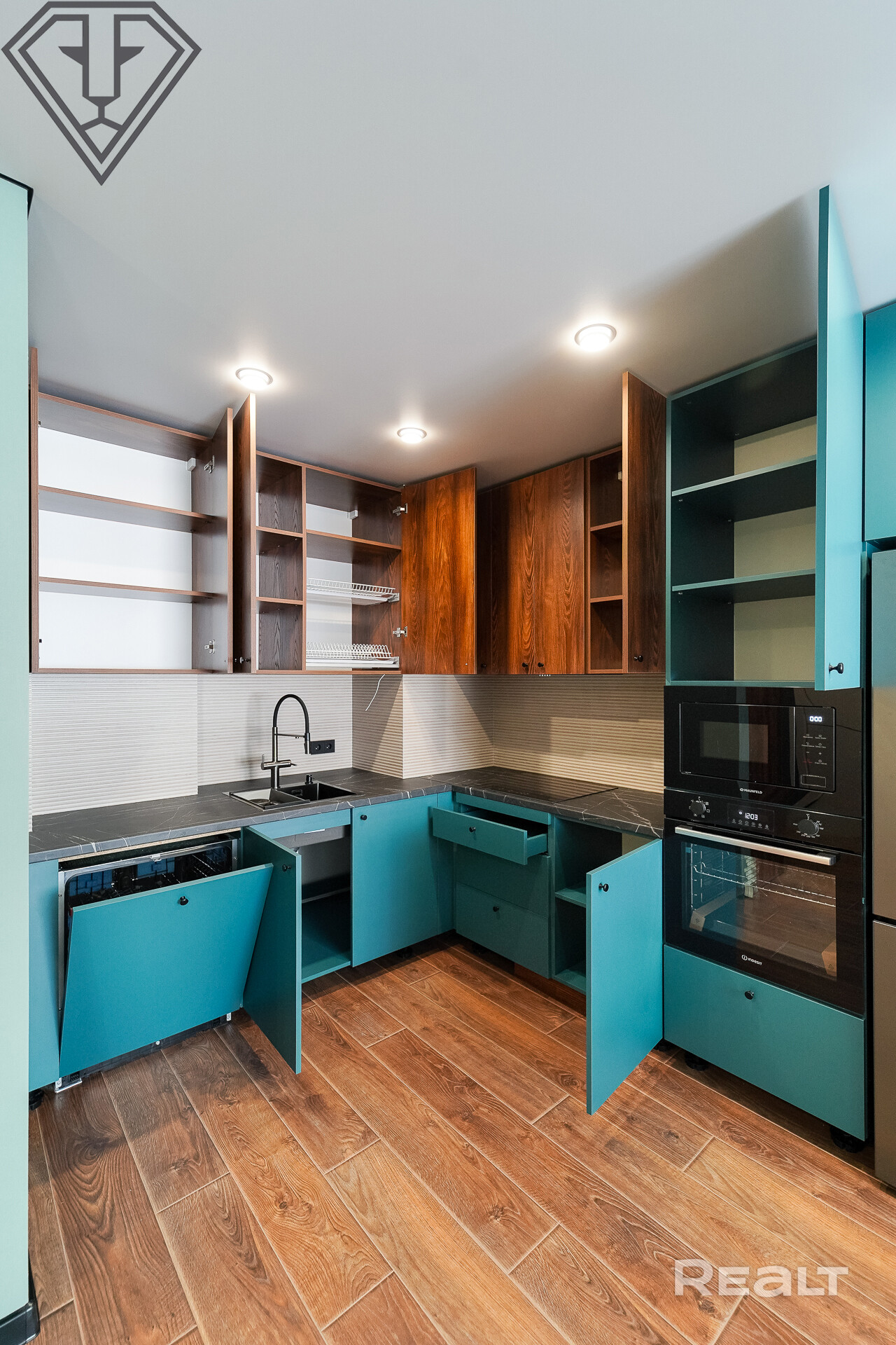 Встроенная кухня с техникой: индукционная варочная панель, вытяжка, духовой шкаф, микроволновая печь, посудомоечная машина, холодильник.