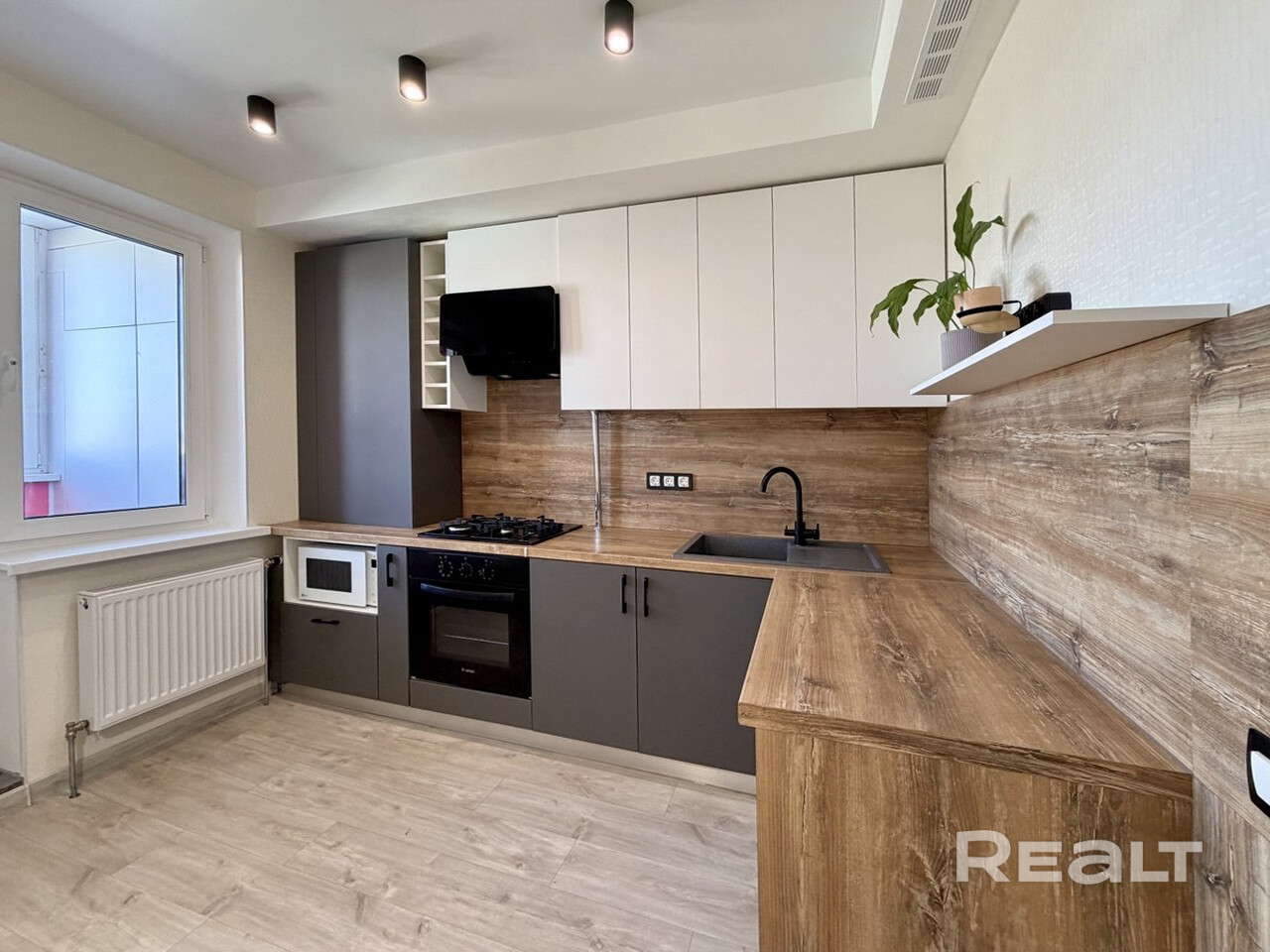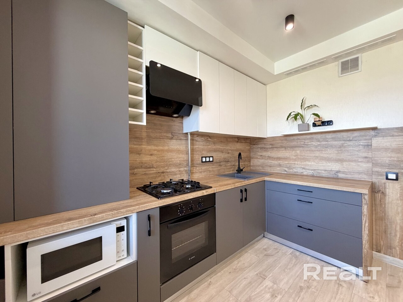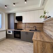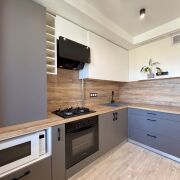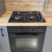 - встроенная кухня с газовой варочной панелью, духовым шкафом и вытяжкой