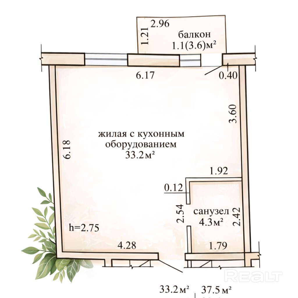 Продуманная планировка: 33,2 м2 жилая площадь. Французское остекление с выходом на балкон.