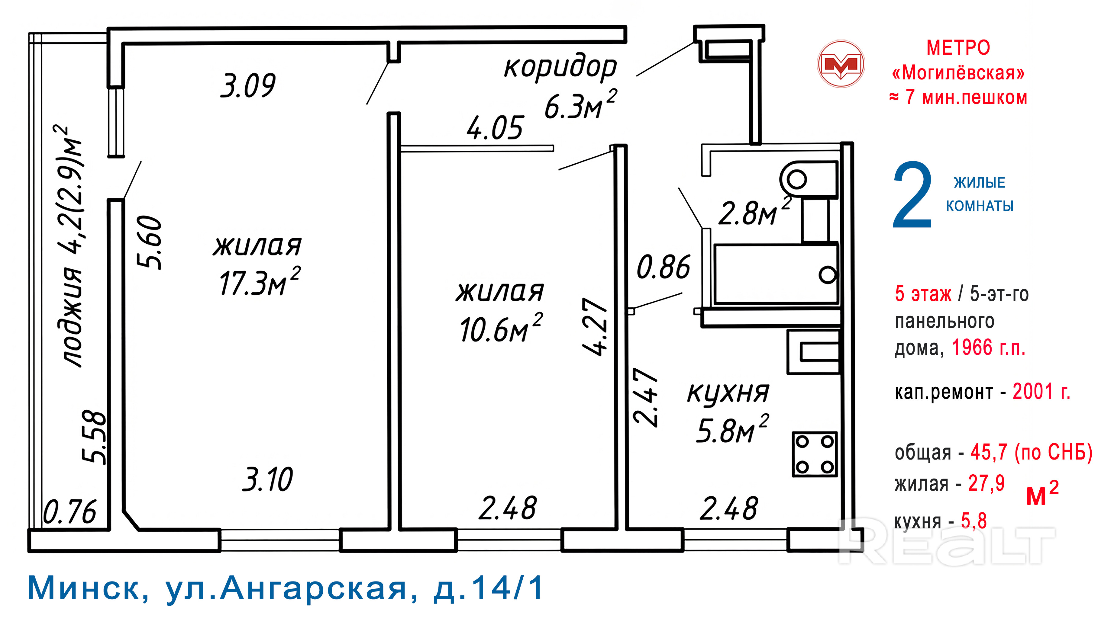 Общая площадь — 45,7 кв.м по СНБ, жилая — 27,9 кв.м, кухня — 5,8 кв.м.