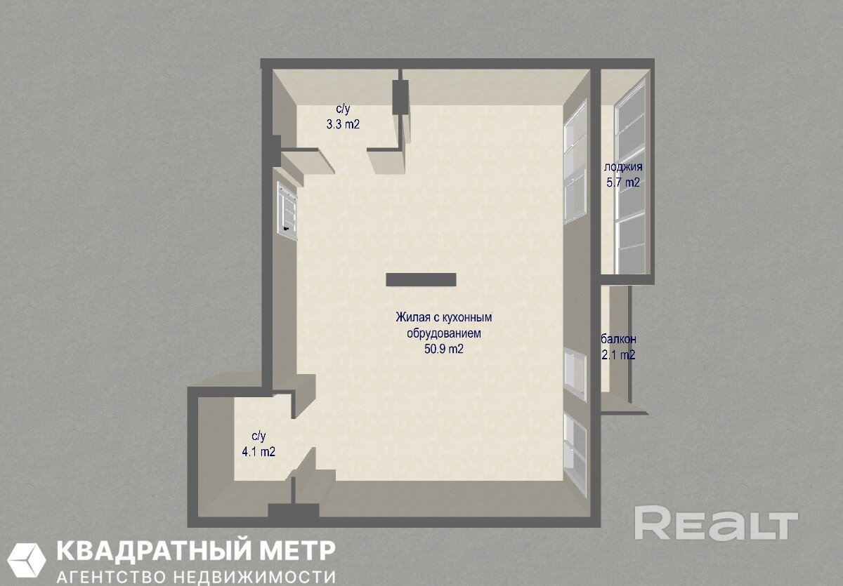 · Удобства: Два санузла (3,3 м2 и 4,1 м2), а также лоджия (5,7 м2) и балкон (2,1 м2).