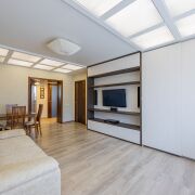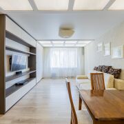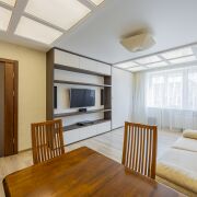 - Натяжные потолки в жилых комнатах и кухне, потолок в гостиной - гипсокартон.