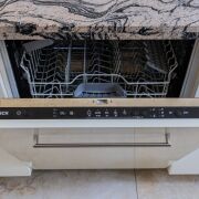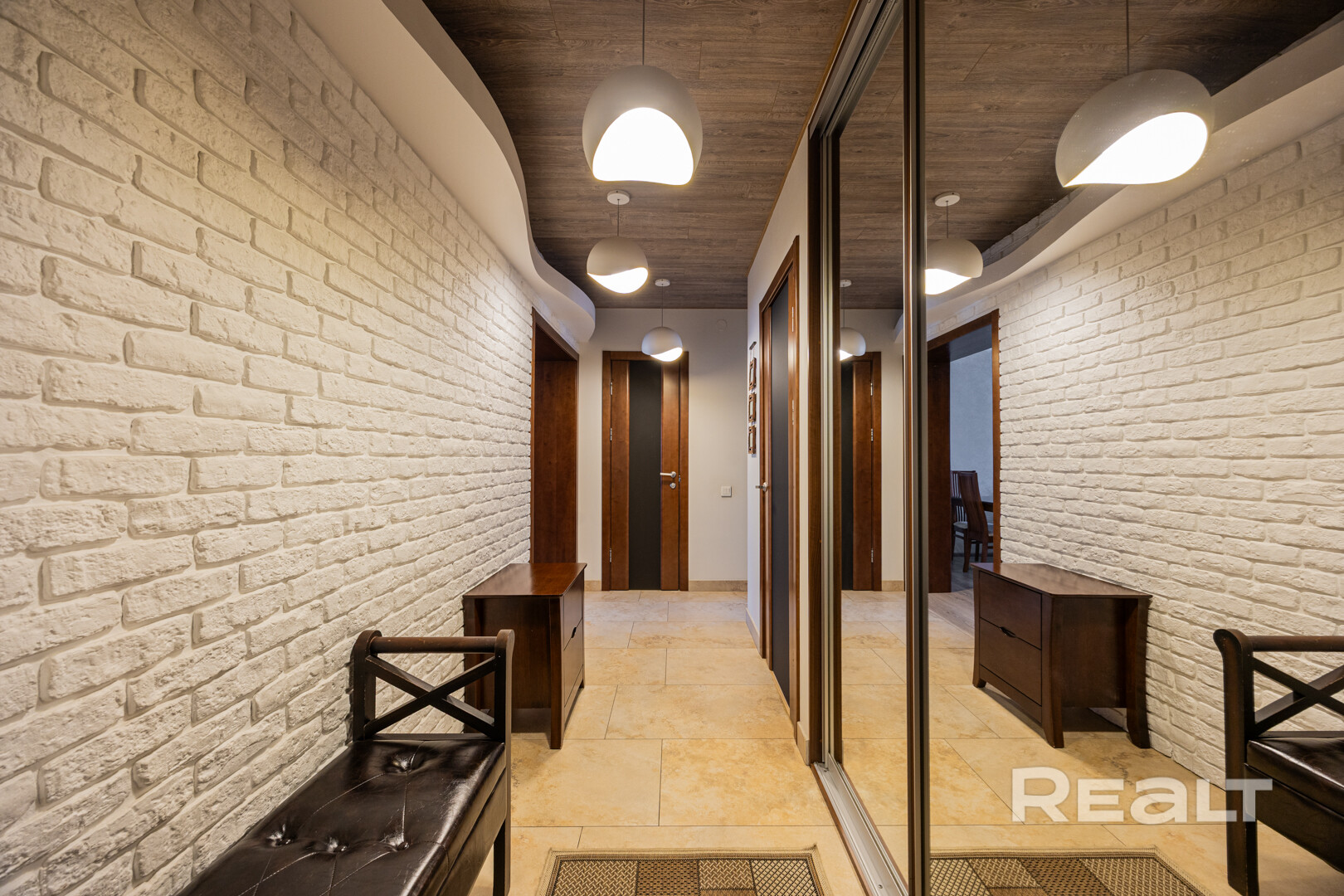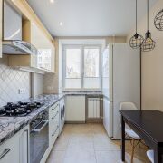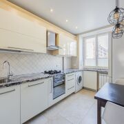 - Кухня из крашенного МДФ и каменной столешницей: посудомоечная машина, газовая варочная панель, вытяжка, новый вместительный холодильник. Установлена стиральная машина. Раскладной обеденный стол из массива.