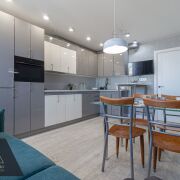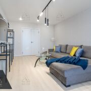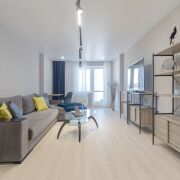 Сердце дома — кухня-гостиная (17 м2). Панорамные окна наполняют комнату мягким светом и открывают вид на благоустроенный двор. Здесь нет шума дорог — только спокойствие и зелень. Высокие потолки, авторские сценарии освещения и встроенная техника премиум-класса подчеркивают статус интерьера.
