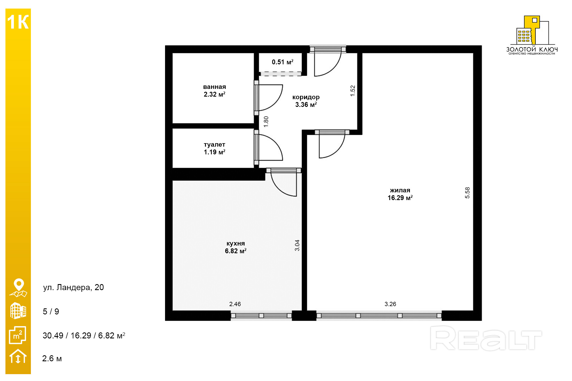 - общая площадь — 30,49 м2