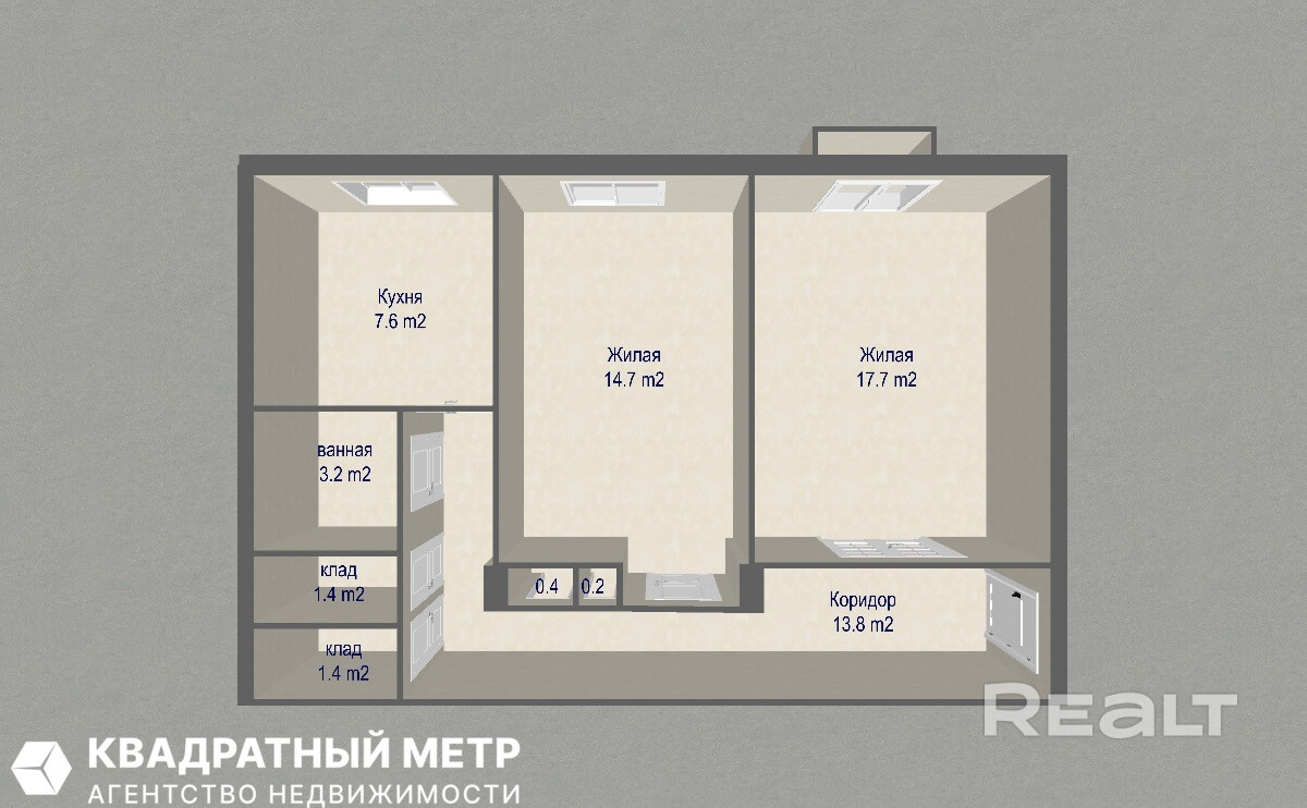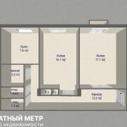 Отличная планировка: общая площадь – 60,9 м2, жилая площадь 32,4 м2 (комнаты 17,7 и 14,7 м2), кухня 7,6 м2, ванная комната: 3,2 м2, туалет 1,4 м2. Изолированные комнаты правильной формы.