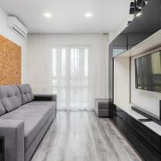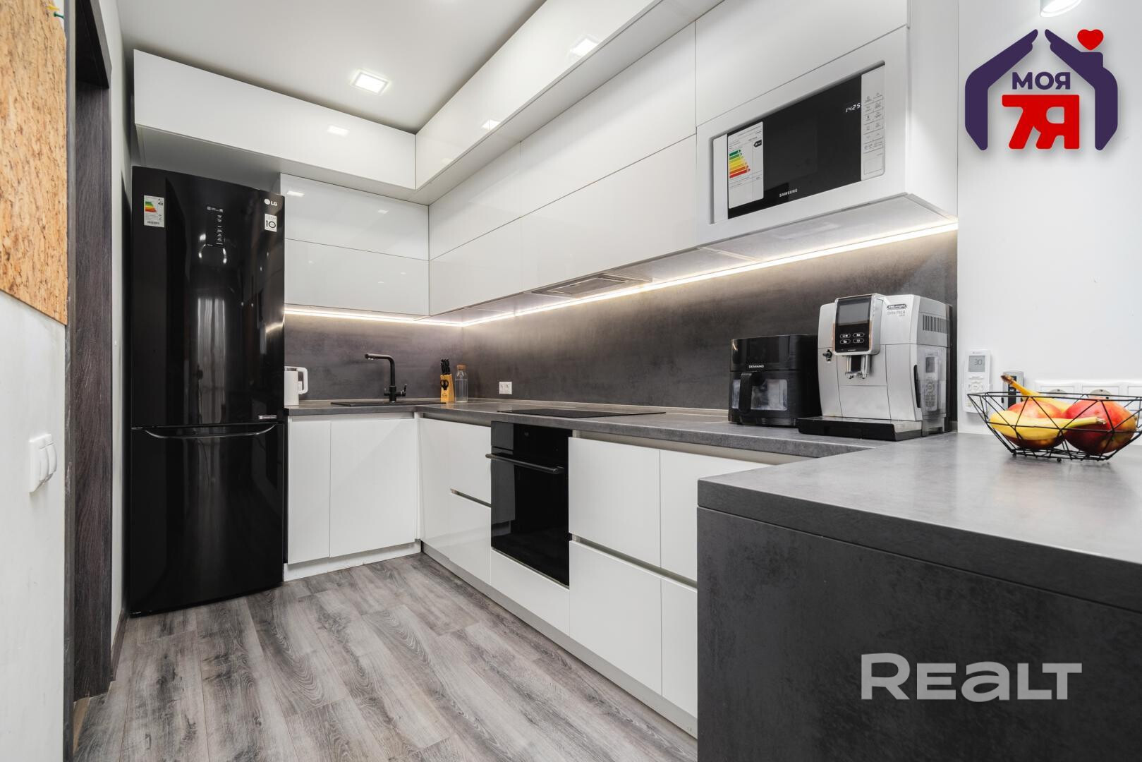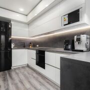-Техника и оборудование: варочная поверхность индукционная Samsung (энергоэффективна, быстро нагревает, легко чистится), духовой шкаф Samsung (конвекция, таймер, стильный дизайн), встроенная микроволновая печь Samsung (компактна, мощная), холодильник LG (инверторный компрессор, экономит электричество, большой объём), посудомойка Bosch 45 см (европейское качество, тихая работа, множество программ).