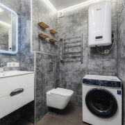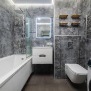 -Совмещённый санузел: керамогранит на полу, просторная ванна шириной 80 см (удобно для расслабляющих ванн), современное зеркало с интегрированной LED-подсветкой (идеально для утреннего макияжа и вечерних процедур), инсталяция для скрытого монтажа унитаза (стильно, практично, легко чистить).