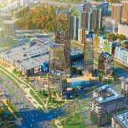 Зеленая парковая зона, международный финансовый центр и крупнейший торговый центр Авиа Молл в центре комплекса.
