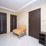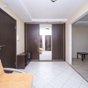 Ремонт в квартире выполнен в светлых тонах с контрастными акцентами межкомнатных и входной дверей, а также корпусной мебели
